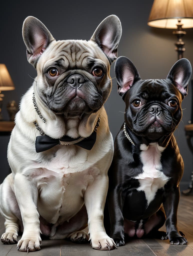 The image must be two female dogs, one is a gray pug with pretty face and the another dog is a black and white french bulldog. The french bulldogs is pregned and the background must be color gray like the photo studios background. The image must be detailed ultra super 4K details