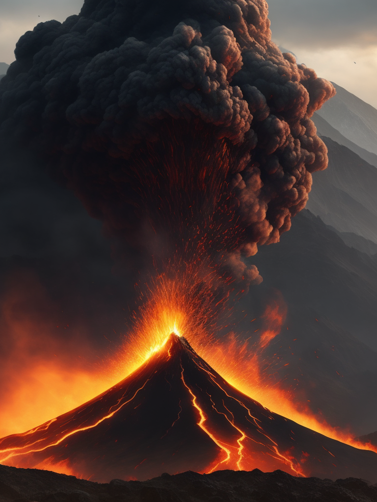 The image of a volcano erupting into the sky, a large mountain, black smoke, flowing lava, high quality details