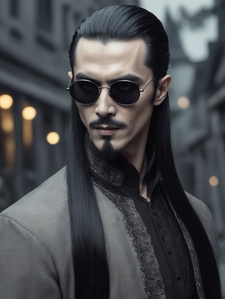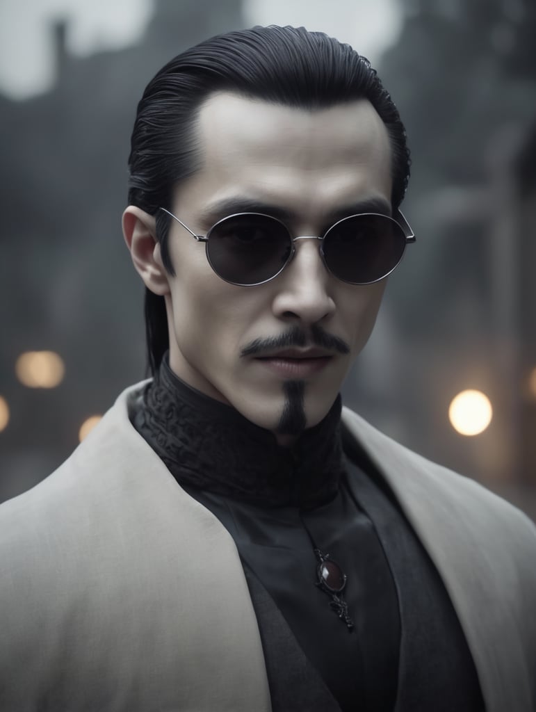 A thin, pale vampire with gray skin, a long pointy black goatee and a black ponytail, wearing round sunglasses at night.https://lumenor.ai/terms-of-service/https://lumenor.ai/ai-generated-images-gallery/cxkbfFAgd/lumenor AIlumenor AI
