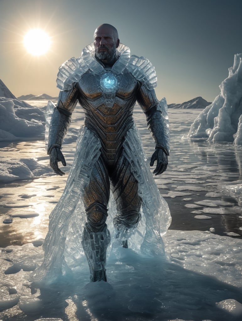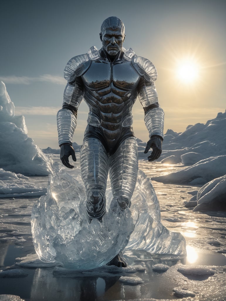 Translucent man made from the ice, walking on the surface of the sun