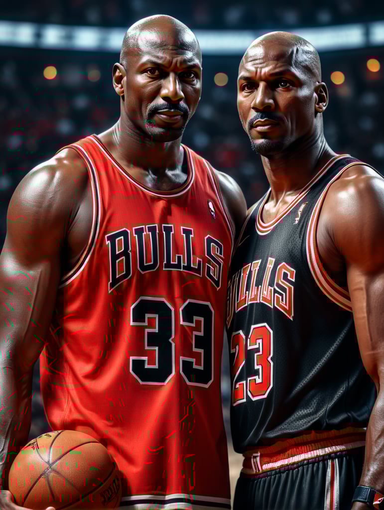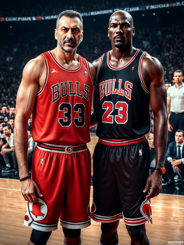 Turkish actor Murat Unalmis standing next to Michael Jordan wearing a Chicago Bulls Jersey and holding a basketball.https://lumenor.ai/terms-of-service/https://lumenor.ai/ai-generated-images-gallery/h3XKayoumM/lumenor AIlumenor AI