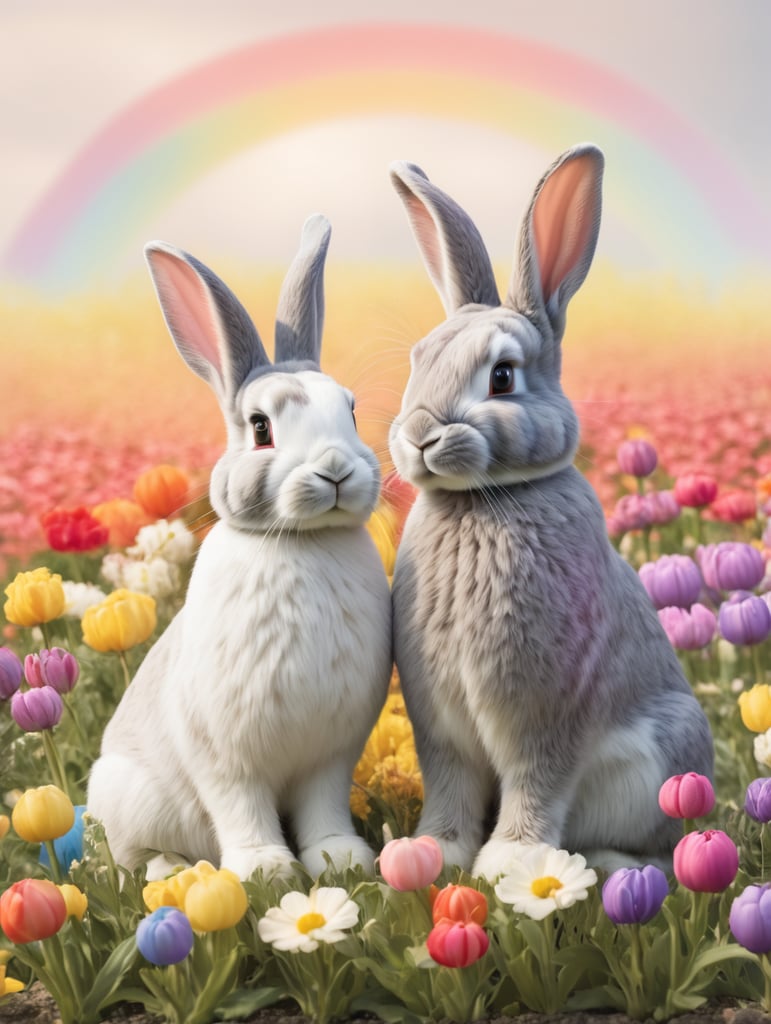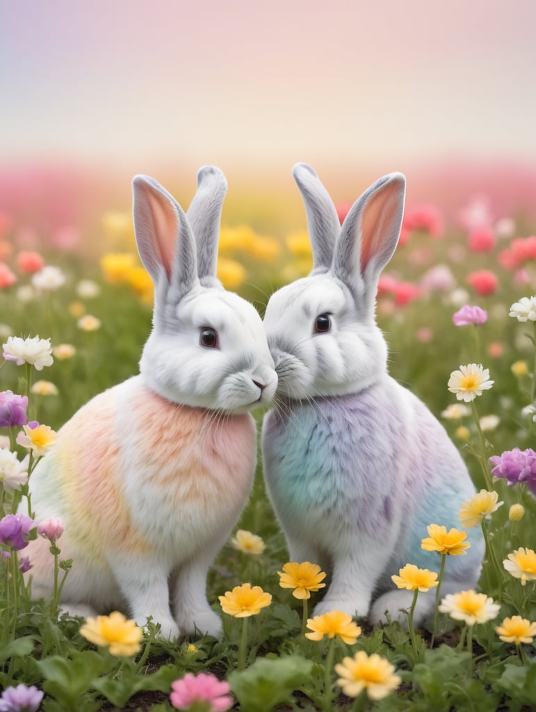 - rainbow bunnies flower field colorful bunnies vibrant landscape bunny in nature rainbow colored animals whimsical creatures joyful rabbits nature's beauty playful animal companions