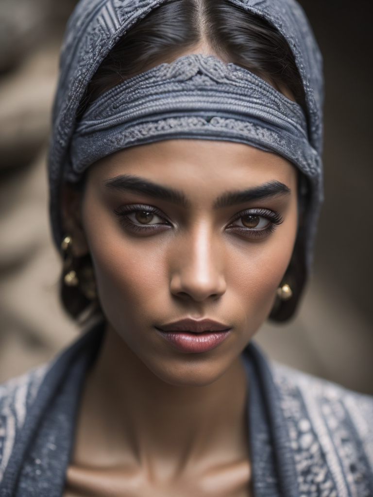 ultra hd! realistic! hyper realistic, photorealistic, hyperrealism, intricate, highly detailed, daylight, best quality, dslr, testptall indian female model walking down a fashion runway inside a cave, model is wearing a grey blue knit mini dress alexander mqueen style with east indian embroidery