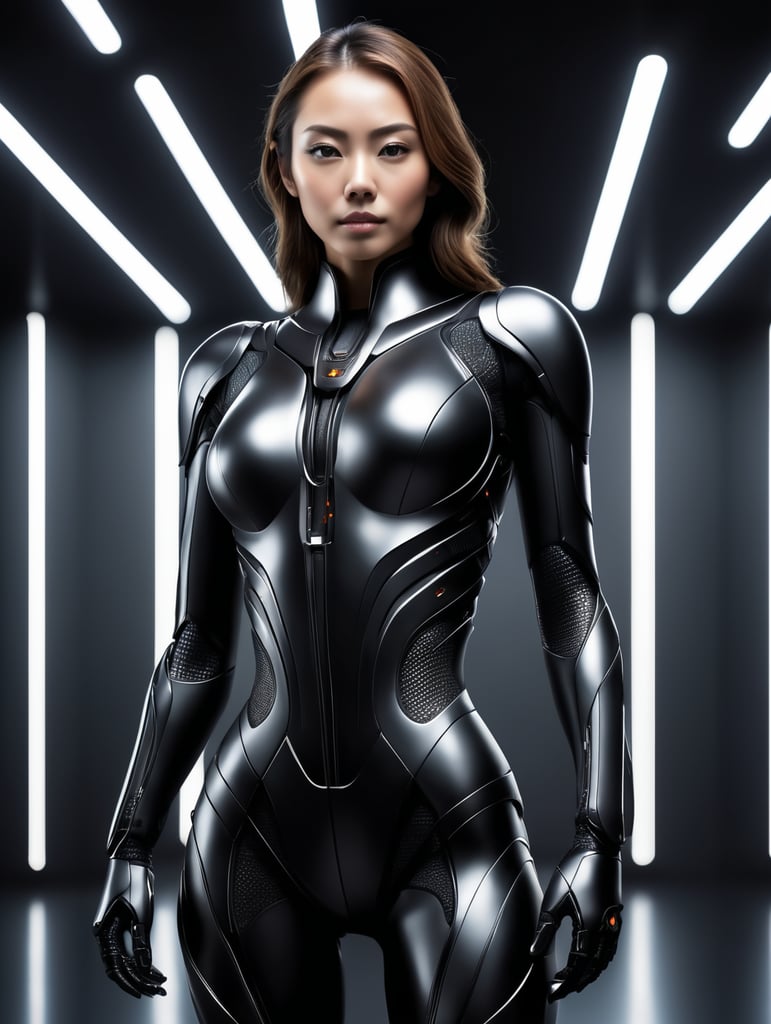 - ultrarealistic minimalist futuristic full body power suit black matte metal and polymer full crystal hull fit woman imposing modern minimalism elegant dystopia