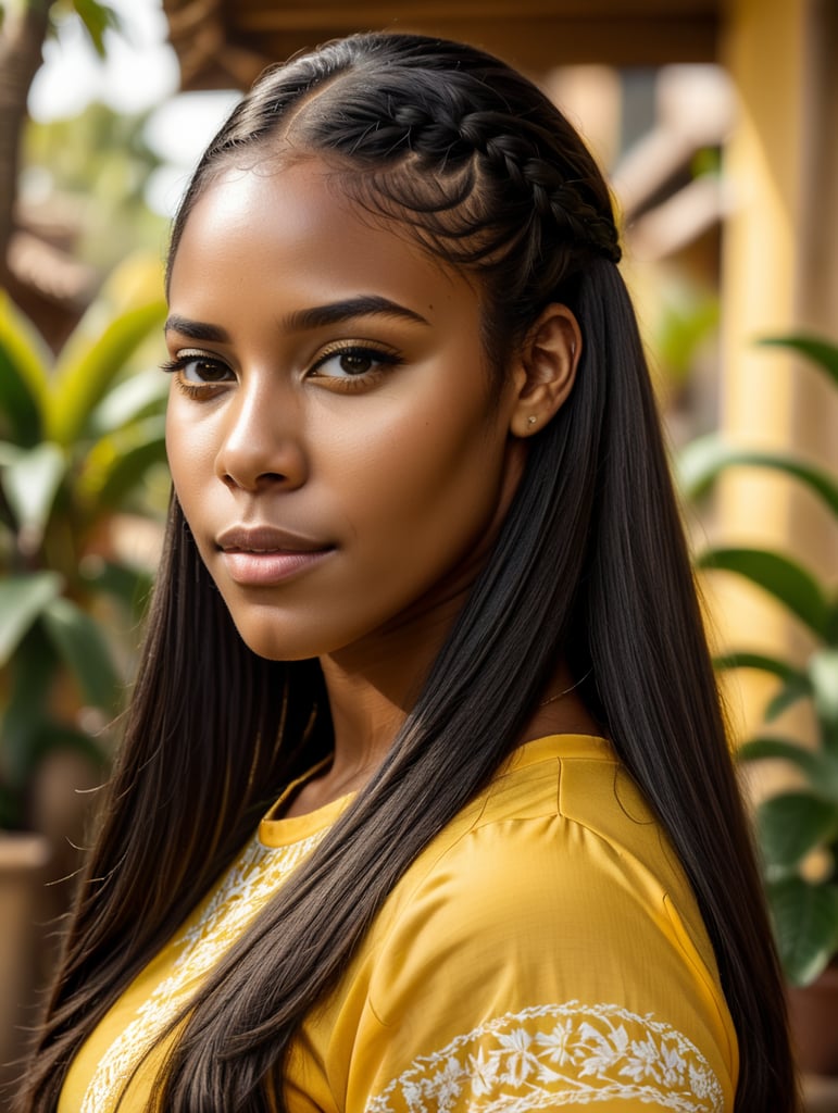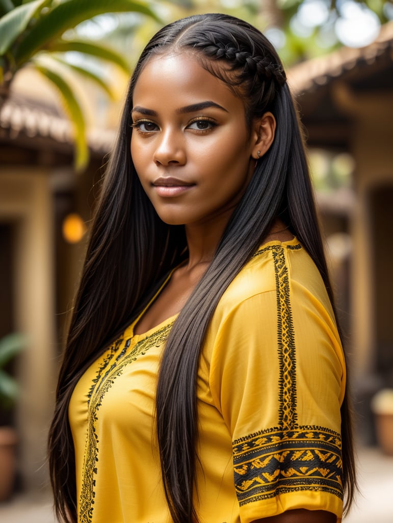 - beautiful black girl straight hair long hair black hair thick hair braid hairstyle yellow top mexican environment hyper realistic image detailed photo