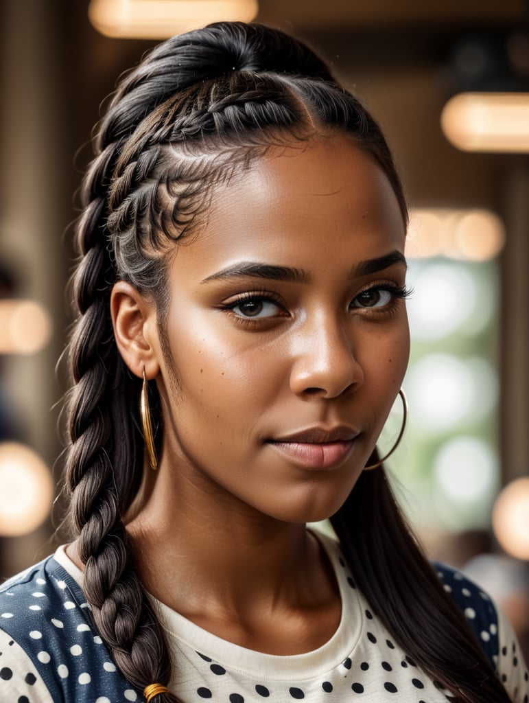 - beautiful black girl straight hair thick hair long hair braided hairstyle polka dot shirt realistic photo detailed image hipster style black hair
