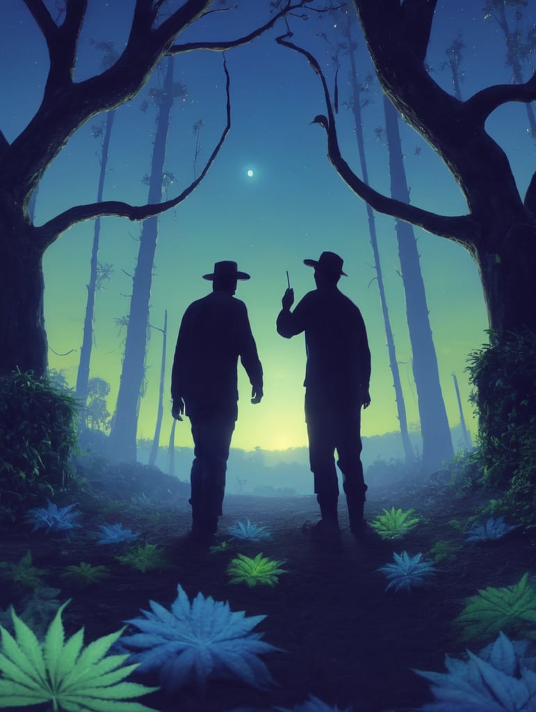 Using only the colors in the reference image, show a peaceful and relaxing glowing hemp farm