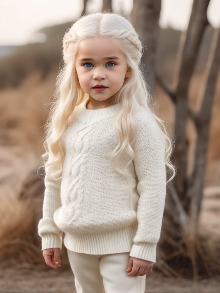 very beautiful girl Daenerys Targaryen, platinum blonde with long hair, woolen white knitted wool sweater and pants, 3 years old toddler, photo for apparel mock-uphttps://lumenor.ai/terms-of-service/https://lumenor.ai/ai-generated-images-gallery/g9znfwp7O/lumenor AIlumenor AI