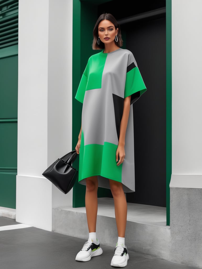 Minimalist dress with an oversized cut in black and gray scale with subtle details in vibrant colors inspired by the work of Luis Barragan placed on a beautiful lady with green eyes with Streetwear sneakers