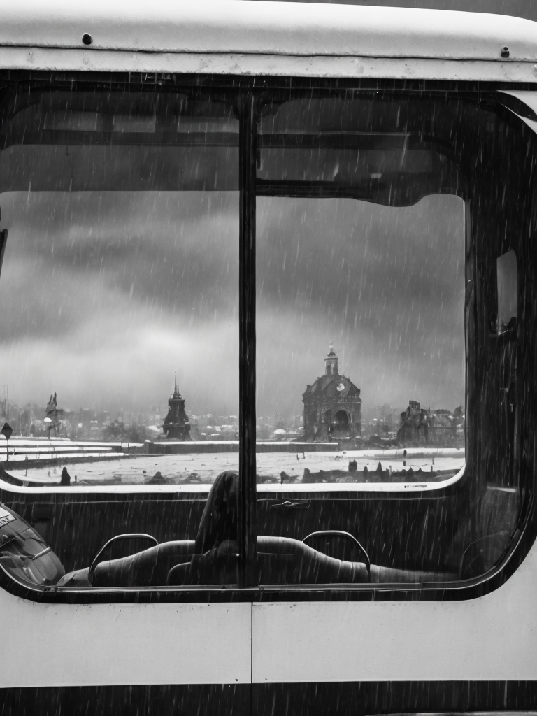 - bus commute workday journey inside the bus window view winter 1978 berlin bus rainy day black and white image realistic scene busy people