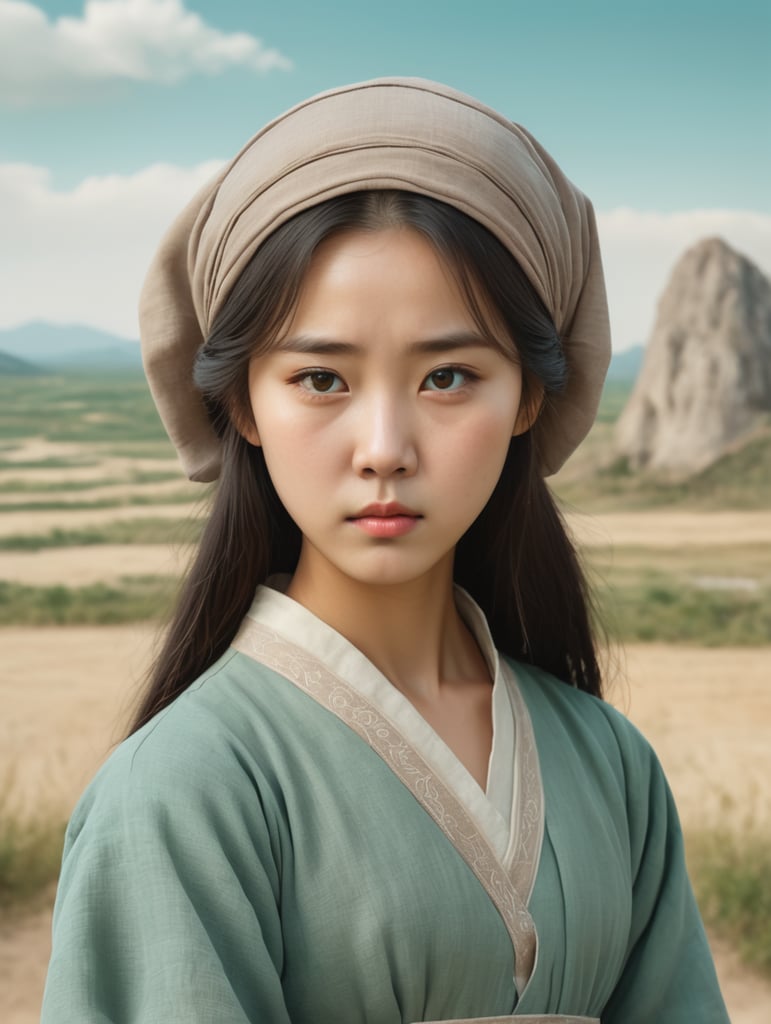 Vintage front view portrait of a sad-looking young and very cute Korean girl, wearing a simple earth colored linen medieval dress and a linen coif, standing in front of vast landscape with a bright turquoise sky, muted earth colors, highly detailed, realistic