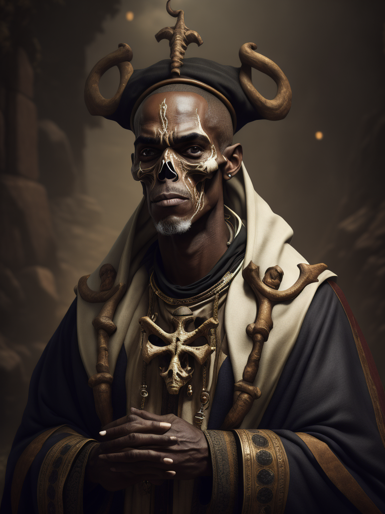 Voodoo priest, photorealistic, skull and bones, mysterious, african american, high definition, photography, cinematic, detailed character portrait, detailed and intricate environment, detailed and intricate environment.