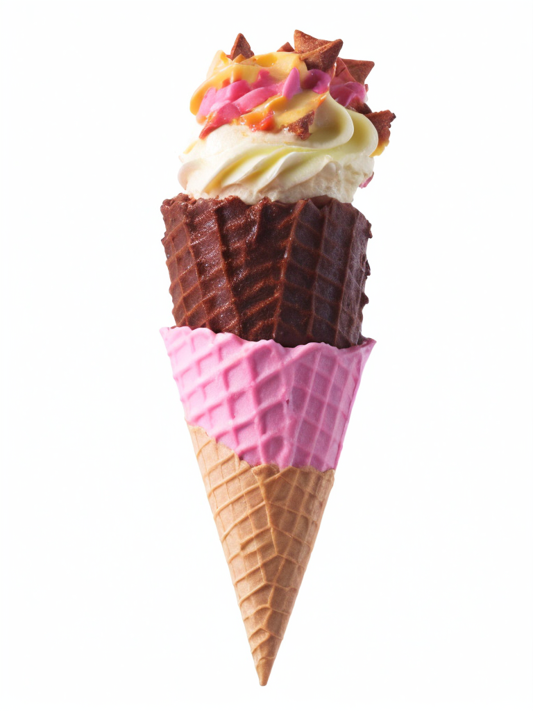 Waffle cone with multi-colored ice cream and chocolate syrup on top, against a yellow background, high quality detail, focus on ice cream, blurred background