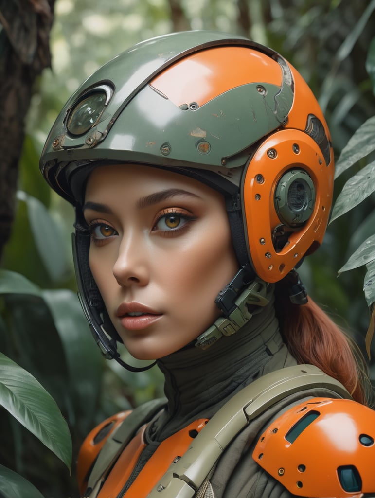 - waist up portrait muted photo female alien futuristic jungle setting broken helmet tangerine color muted palette detailed image 8k resolution