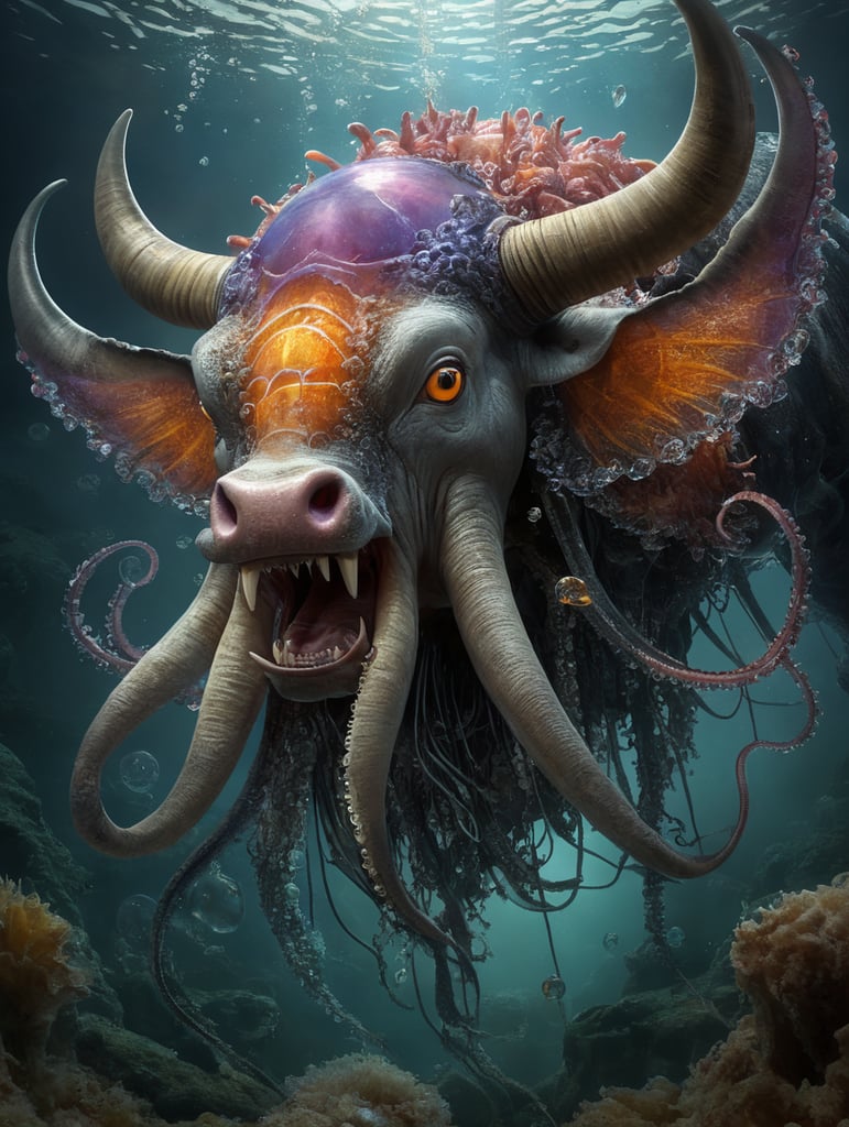 i want an image of a new type non existing animal. It must be a combination of a cow and a jellyfish. The image should include the head of the cow and the tentacles of the jellyfish