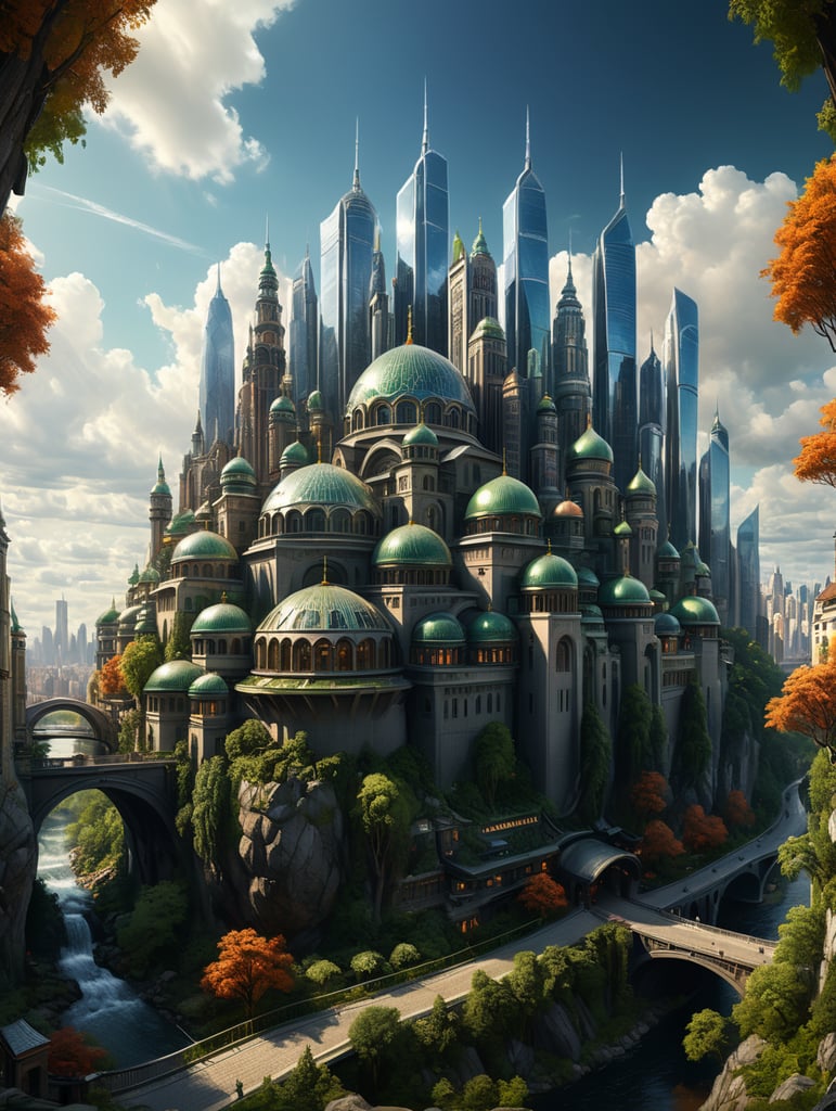 - future cityscape skyscrapers tree lined walls hilly landscape serene rivers soft lighting beige and orange tones russian style house futuristic urban design nature inspired metropolis