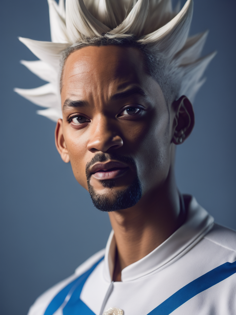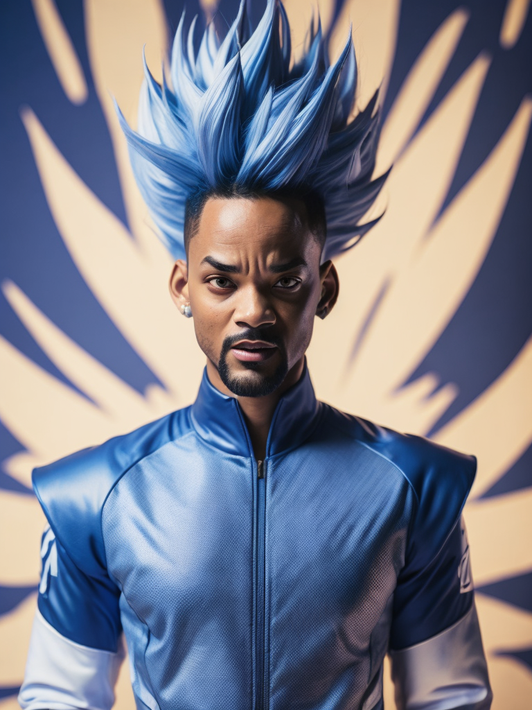 Will Smith as Dragon Ball character Vegeta, aggressive face, blue and white suit, spiky hairstyle, bright saturated colors, bright gradient background,