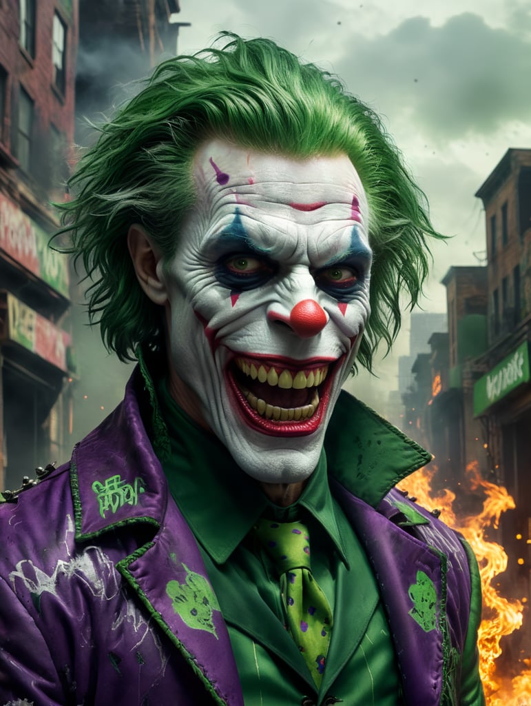 William Dafoe as a demented joker. Violet plush coat, green shirt with graffiti print. green hair. burning city background