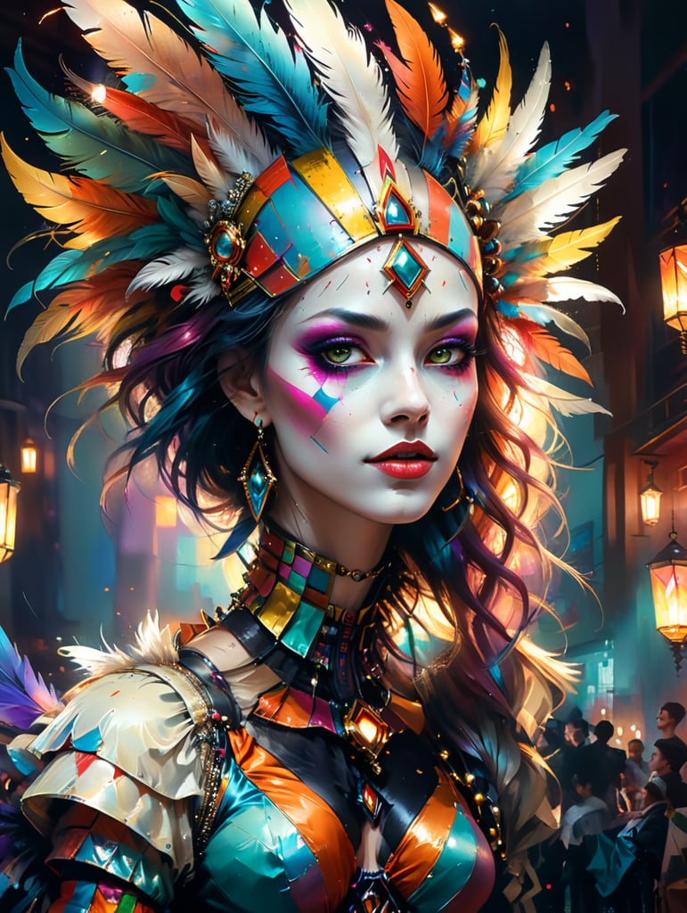 - carnival woman harlequin character party ambiance modern theater hall lights feathers harlequin costume festive atmosphere theatrical performance colorful decor