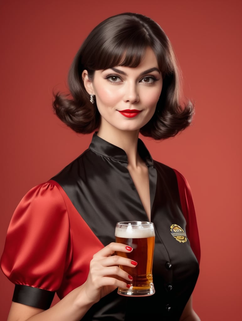 Woman in a red satin blouse and black skirt, 60s style, holding a glass of beer in her hands, red background, studio photo