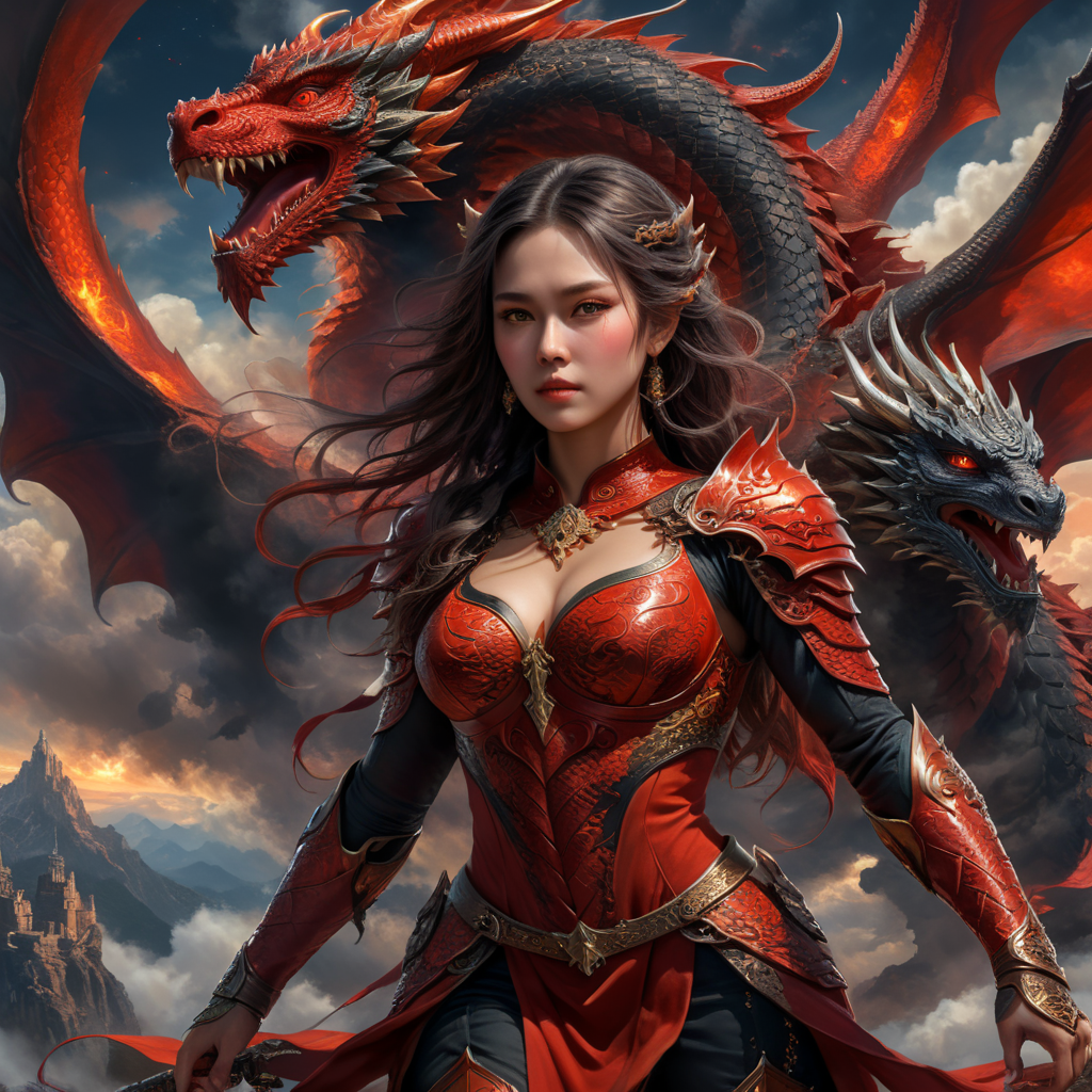 - woman in the sky fair haired woman twelve stars fiery dragon red dragon woman with twelve stars shy woman woman surrounded by stars dragon with seven heads text to image prompt
