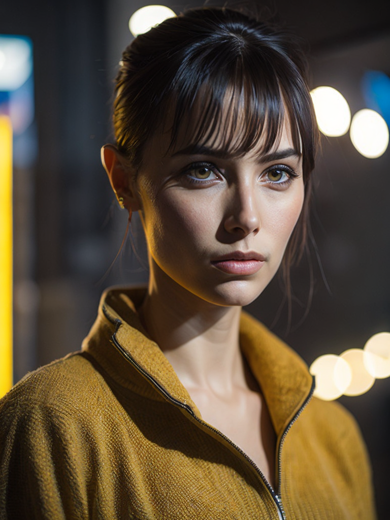 a women looks on the camera, yellow side lighting, focused gaze, canon 50 lens, focus on the face everything else is in blur, the blade runner scene.https://lumenor.ai/terms-of-service/https://lumenor.ai/ai-generated-images-gallery/hlwM5DC0OM/lumenor AIlumenor AI
