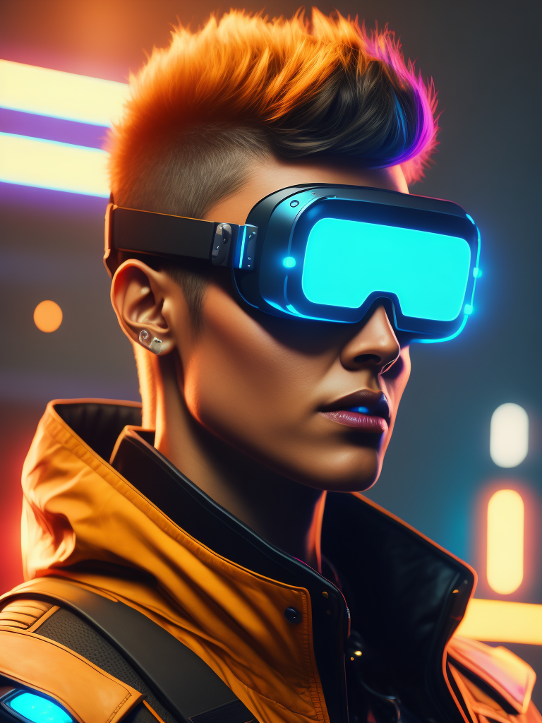 Women wearing virtual reality glasses, cyberpunk style, neon colors, bright colors, bright blue glowing glasses, sharp details, contrasting light