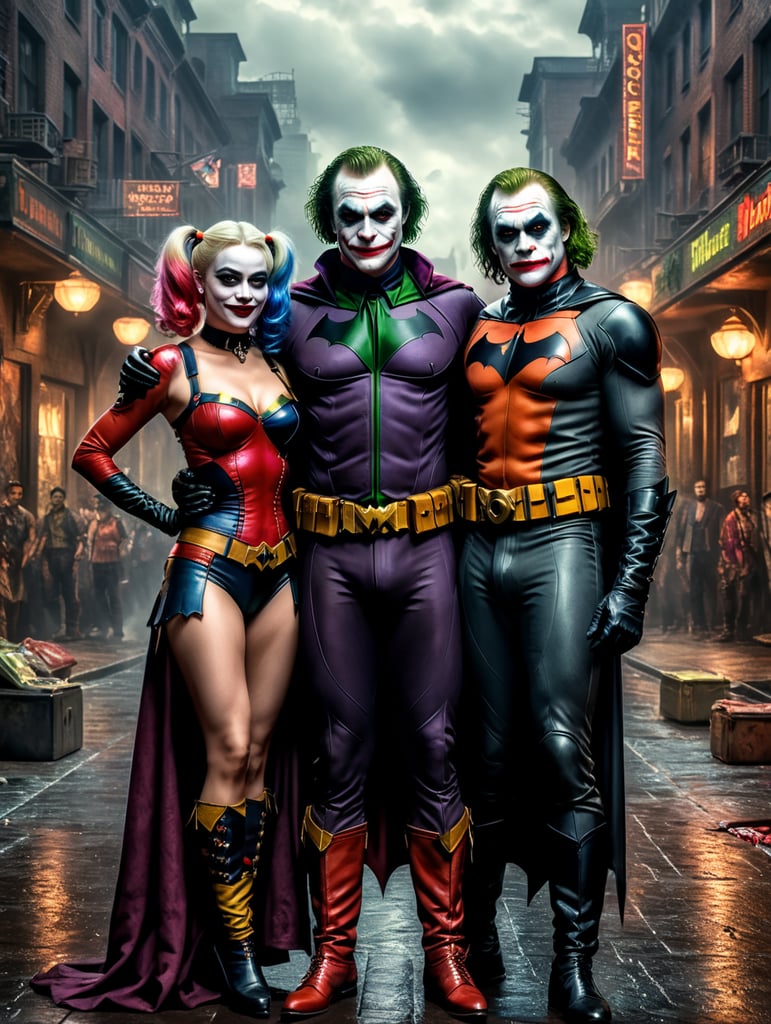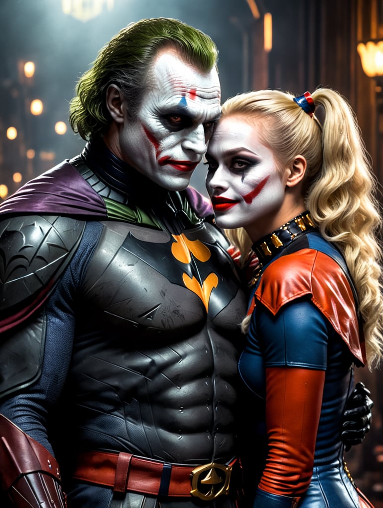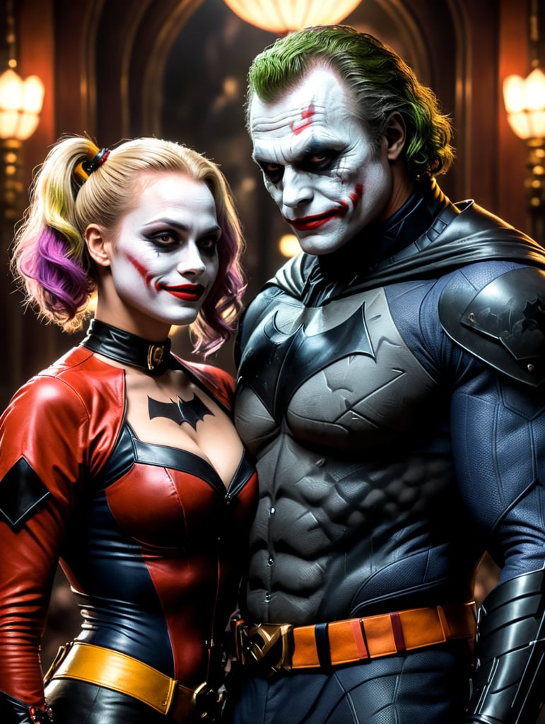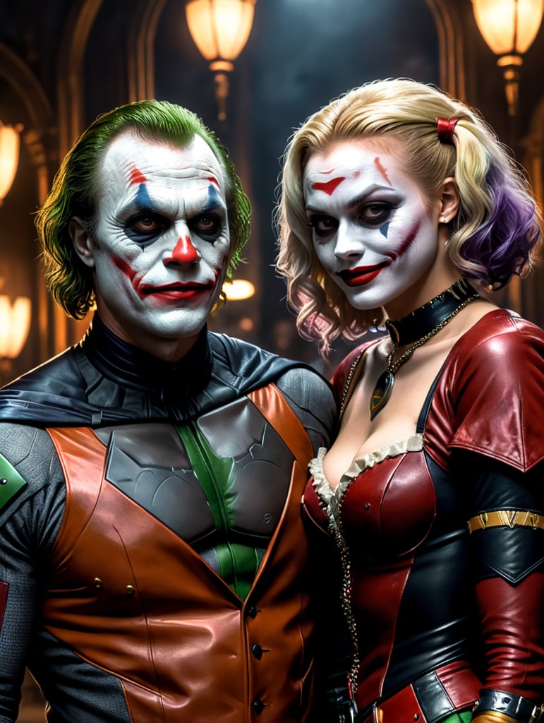 I would like images of Heath ledger and Margot robie as Joker and Harley Quinn, but dressed and campy like the adam west batman