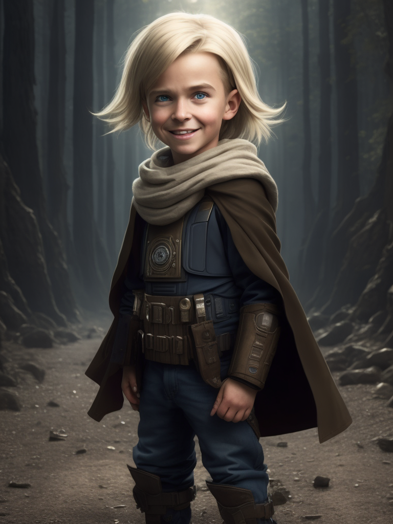 a 6 year old boy adventurer similar to Jedi from starwars, starwars universe, starship troopers and dark vador on the back, creative, and kind-hearted person with short, blonde hair, big blue eyes, small nose, and a smiling mouth, standing centered in 3D style, rendered using beautiful Disney animation, Pixar style, Disney style, 3D style