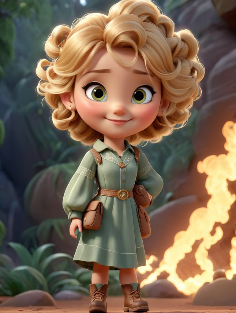 - 20th years old girl avatar beautiful girl attractive dress indiana jones inspired creative person kind hearted long curly blonde hair big eyes disney animation pixar style