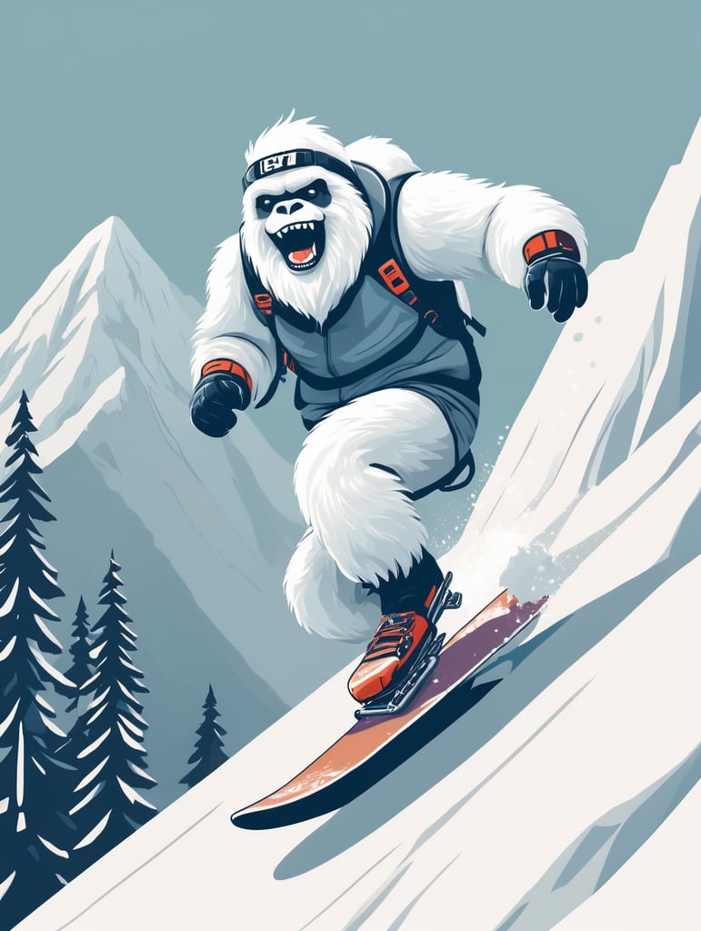 Yeti mascot snowboarding down a mountain, simple colors, logo, illustration style, cute, friendly.