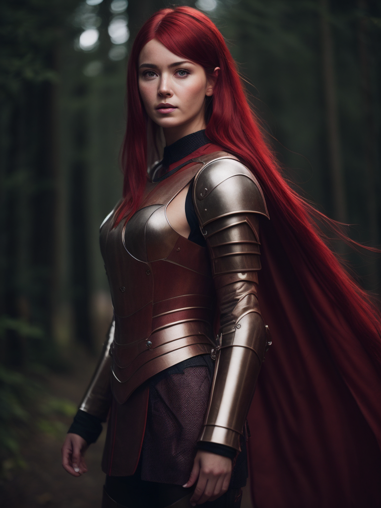 - youngbeautifulgirl redarmor redhair forestbackground burgundytone dramaticlighting detailedarmor depthoffield highdetail blurredbackground