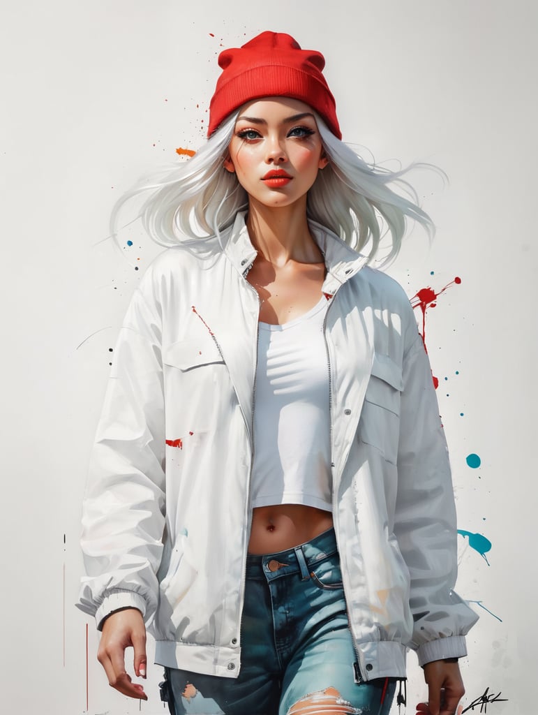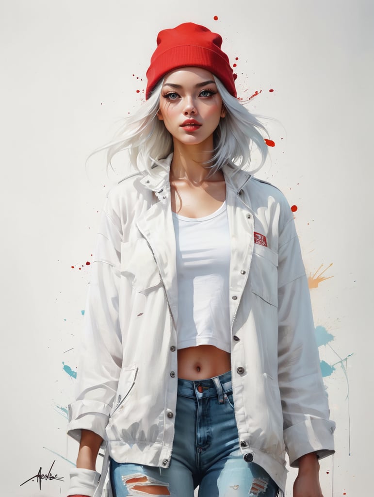 a young women with white hair and red hat on his head is wearing a white lacket, isolated, white background